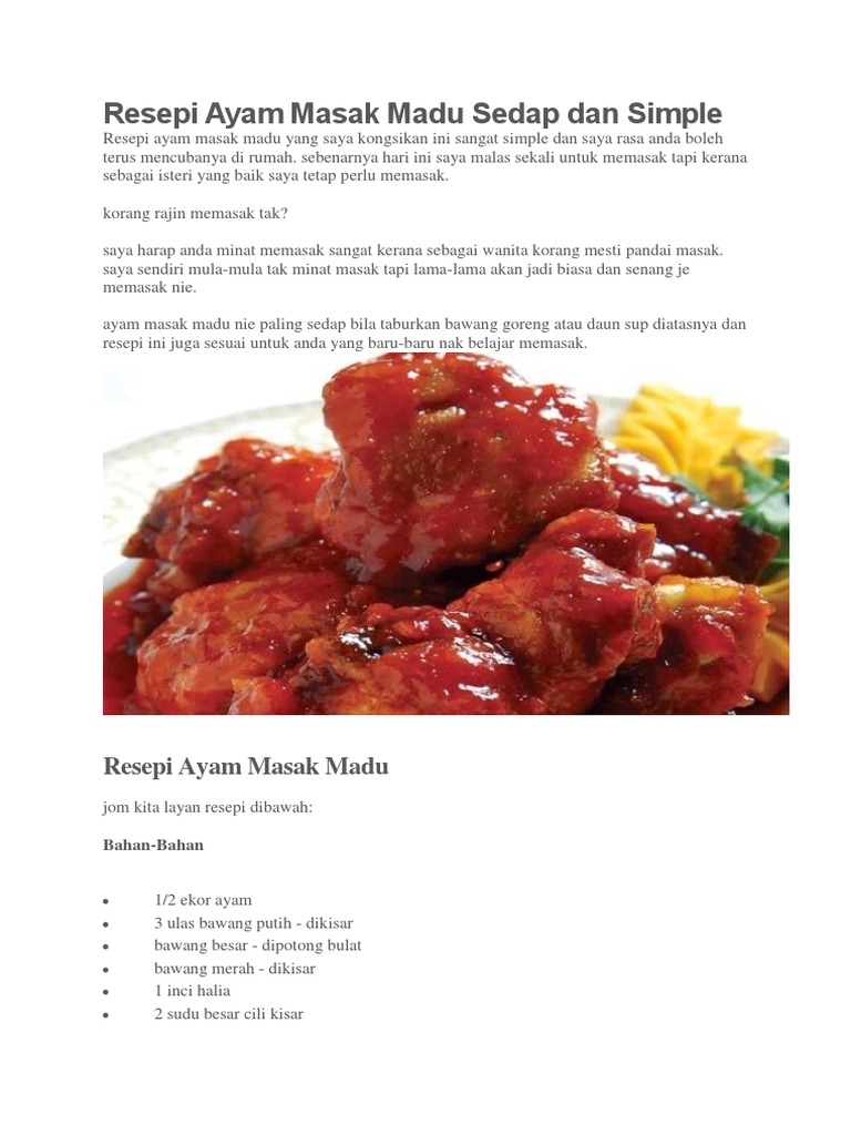 Resepi Ayam Masak Madu Merah Menyala Sedap Makan Dengan Nasi Putih Atau Nasi Berperisa Port Makan from portmakan.com Ayam goreng madu dengan nasi minyak dan sos cili ala thai. Sebenarnya dah lama tak memasak, jadi tekak pun mulalah mengidam nak makan makan macam macam makanan biasa jer pun. Simpan ke bagian favorit tersimpan di bagian favorit. Resep martabak telur kulit lumpia isi ayam suwir pedas. Berikut resep ayam saus madu lemon yang bisa anda coba. Nak pedas letak lagi banyak pon tadehal. Cara buat ayam bakar madu sedap. Begitulah resep dan cara membuat ayam goreng madu yang praktis.